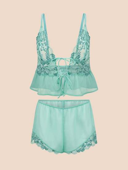 Dainty lace offsets sheer chiffon on this romantic set for an ultra-luxurious feel.