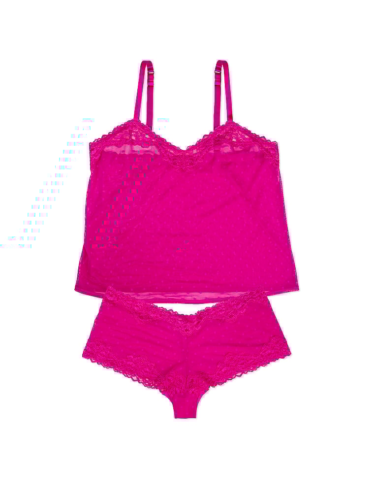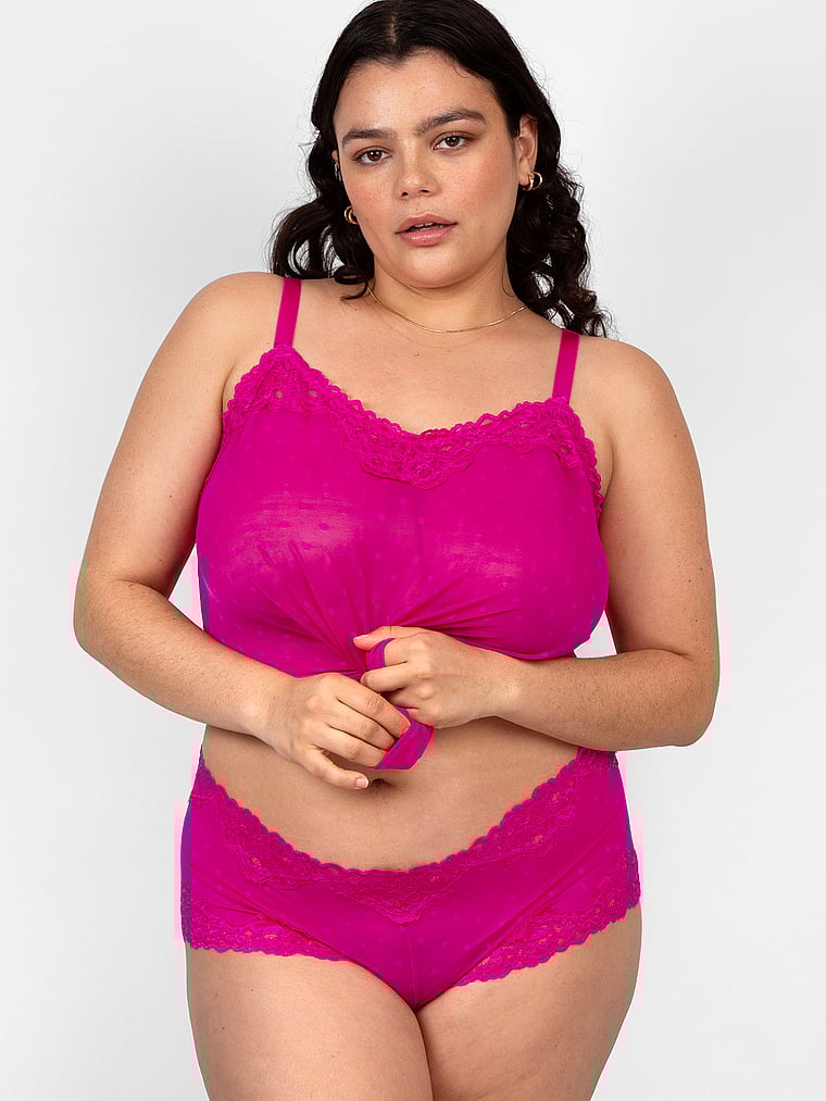 This two-piece set boasts a cami and boyshort combo that's unbeatable for lounging and wearing out. Lace and mesh offer stretchy comfort and playfulness with versatility to mix and match.