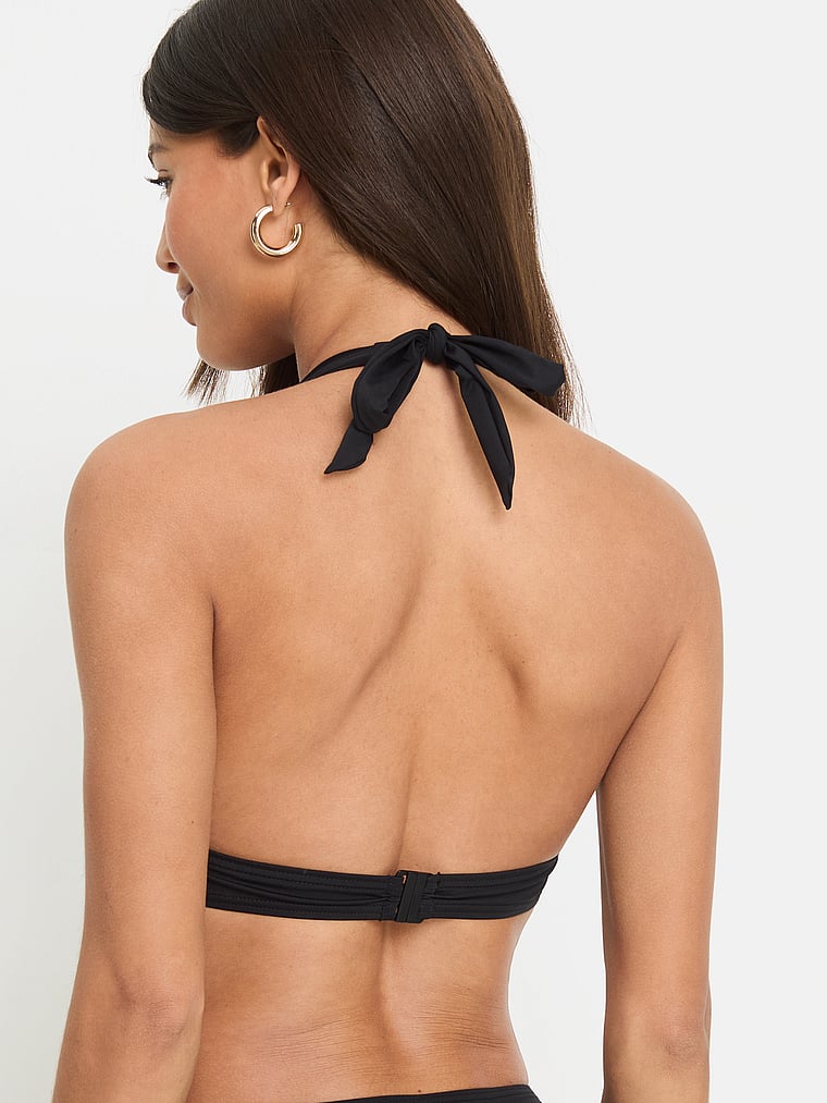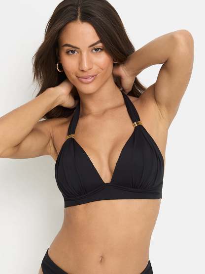 This elegant triangle bikini has polished, glimmering gold accents for a dose of shine. It has a halter top with ties at the neck and a clasp at the back for a secure fit.