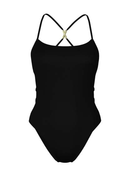 A tropics-ready treasure. X marks the spot where sexy meets sophisticated in this chic, retro-inspired collection featuring provocative, skimpy coverage and hardware-sparked skinny straps. This seductive One-Piece gets a polished upgrade with its strappy back styling.