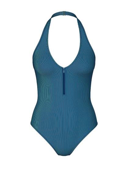 Suit up to make a splash this season in contrast ribbed fabric that lends unique texture and color to this sporty, zip-front One-Piece.
